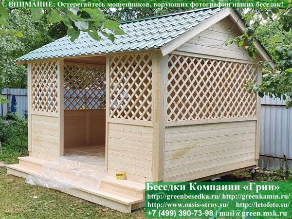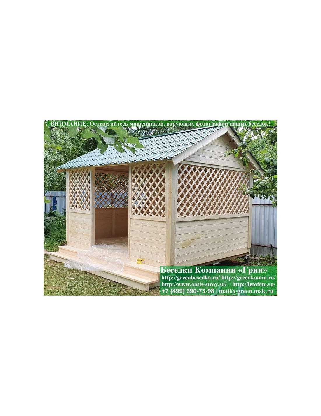 В стандартной поставке в виде кровли на крышу беседок, бытовок, хозблоков 3х4 метра кладется ондулин (мягкий шифер). Вы можете дополнительно заменить его на более надежную металлочерепицу. Цена 8000 руб.