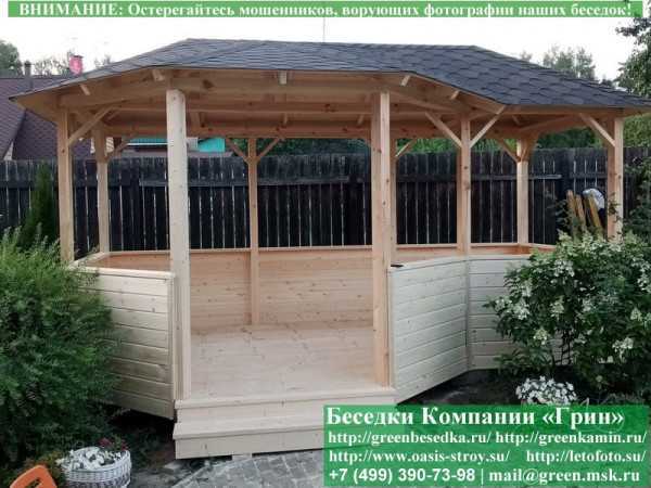 Оригинальная 7-ми гранная беседка изготавливается из сосны, со сплошной одноярусной (вальмовой) крышей. При строительстве беседок используется сухой материал камерной сушки. В качестве несущих стоек используется строганый брус 90х140 мм. Стандартно поставляется открытая беседка, но можно каждую стенку закрыть перголой (решеткой) или сделать глухой. На крышу укладывается мягкая черепица "Технониколь": коричневых, зеленых, бордовых, серых цветов. Срок изготовления и установки беседки на участке составляет 5-10 дней. Беседки поставляются в не крашеном виде. Возможна покраска беседок краской, лаком или обработка цветным антисептиком (дешевый вариант).
