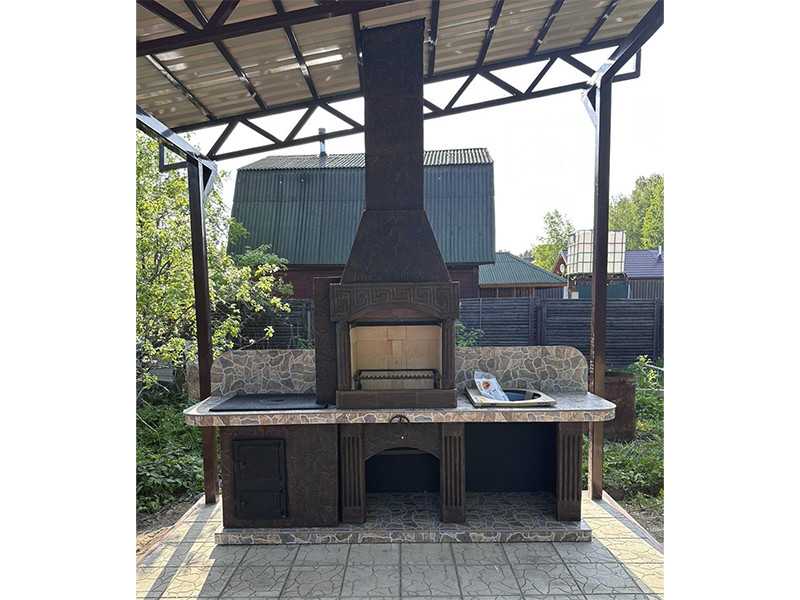 Более длинная часть столешницы хороша в том числе и для установки раковины. Подведя воду к комплексу барбекю, вы сможете на месте мыть посуду, не занося ничего в дом, — и это очень удобно. Если в раковине нет необходимости, это место используют под казан или другой элемент, который требуется именно вам.