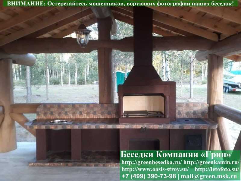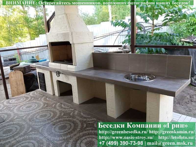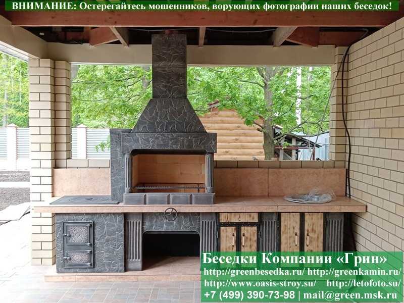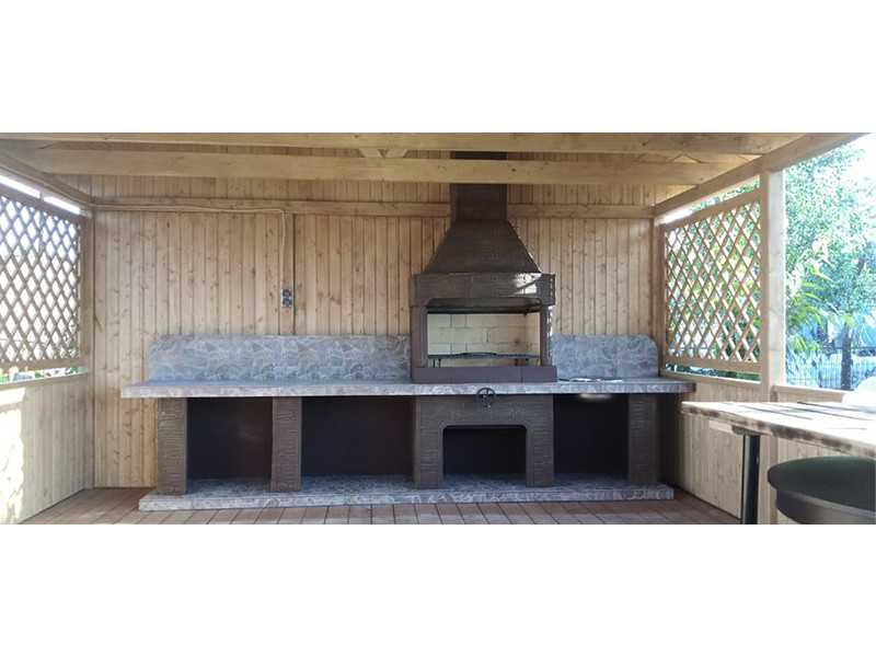 - Нейтральный и очень симпатичный дизайн. Уличный комплекс барбекю впишется в любой ландшафт. Поскольку изделие с дымоходом, его устанавливают и в помещения. Подходят крытые беседки, летние кухни. Средний вариант — это навес: с крышей, но без стен.