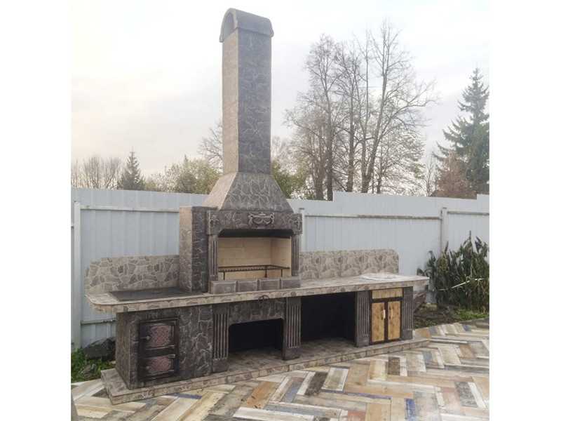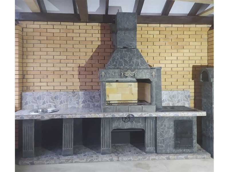Печь-барбекю этой модели представляет собой полноценную кухню — вам остается только провести воду для использования встроенной раковины. У конструкции есть открытая топка и плита, работающая от закрытого огня, так что вы можете готовить почти все блюда. Исключением станут только те рецепты, для реализации которых нужна полноценная духовка. В остальном изделие ничем вас не ограничивает.