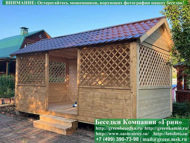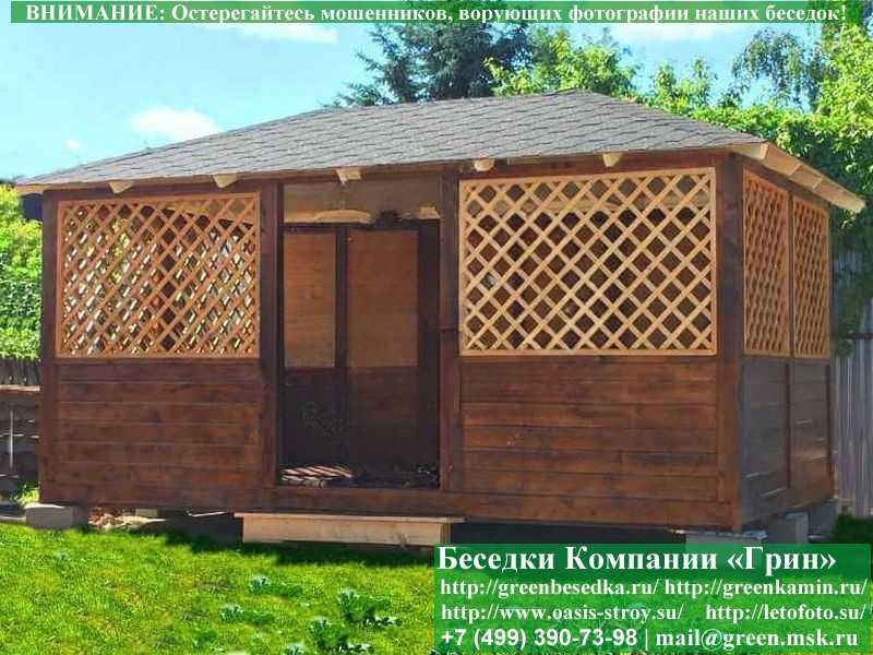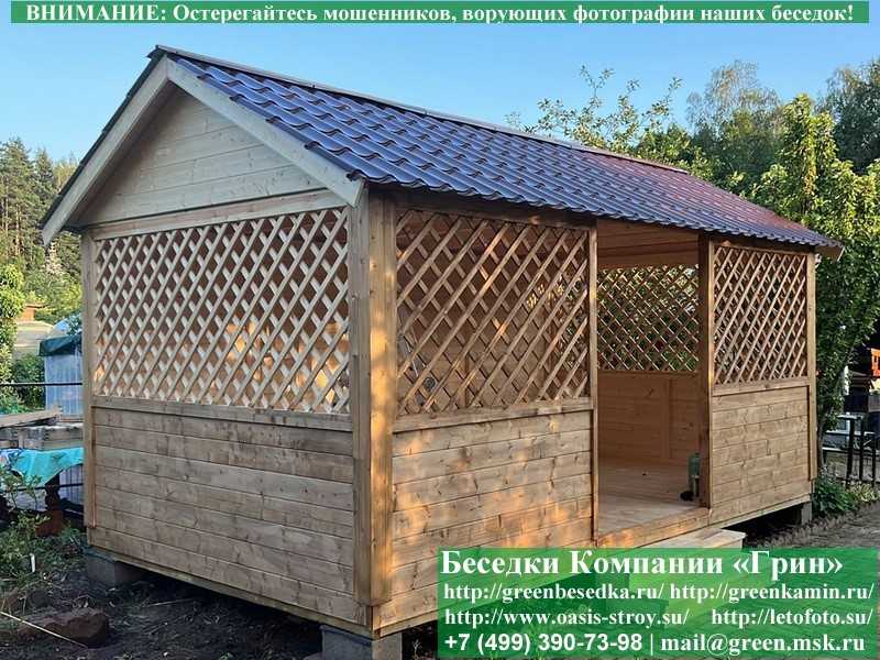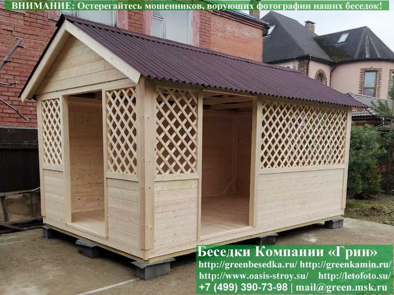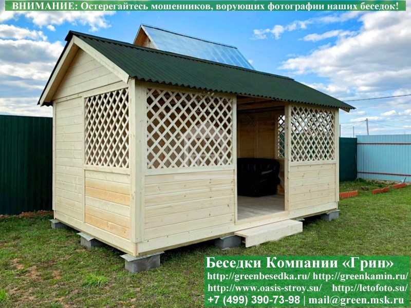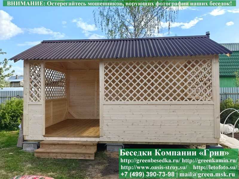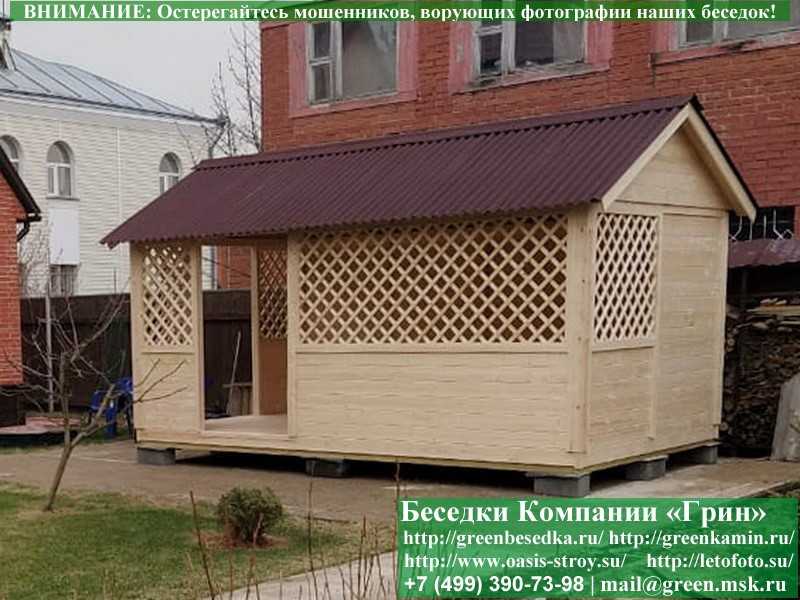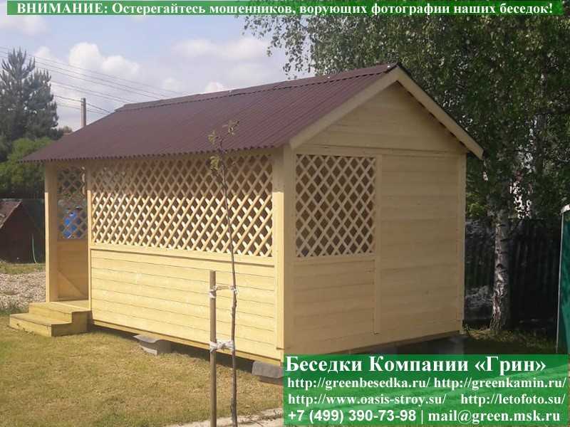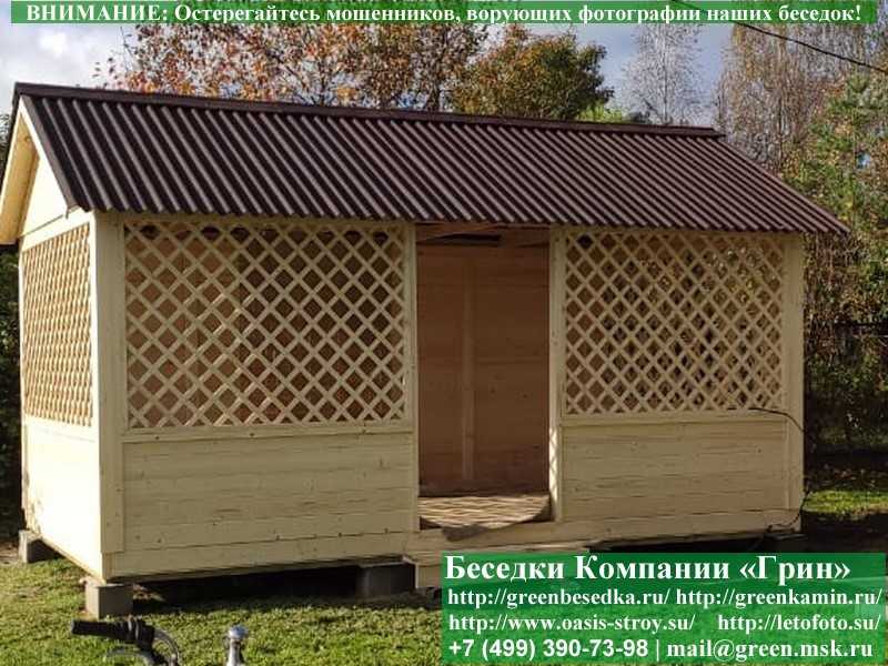 В стандартной поставке в виде кровли на крышу беседок, бытовок, хозблоков 3х5 метров кладется ондулин (мягкий шифер). Вы можете дополнительно заменить его на более надежную металлочерепицу. Цена 10000 руб.