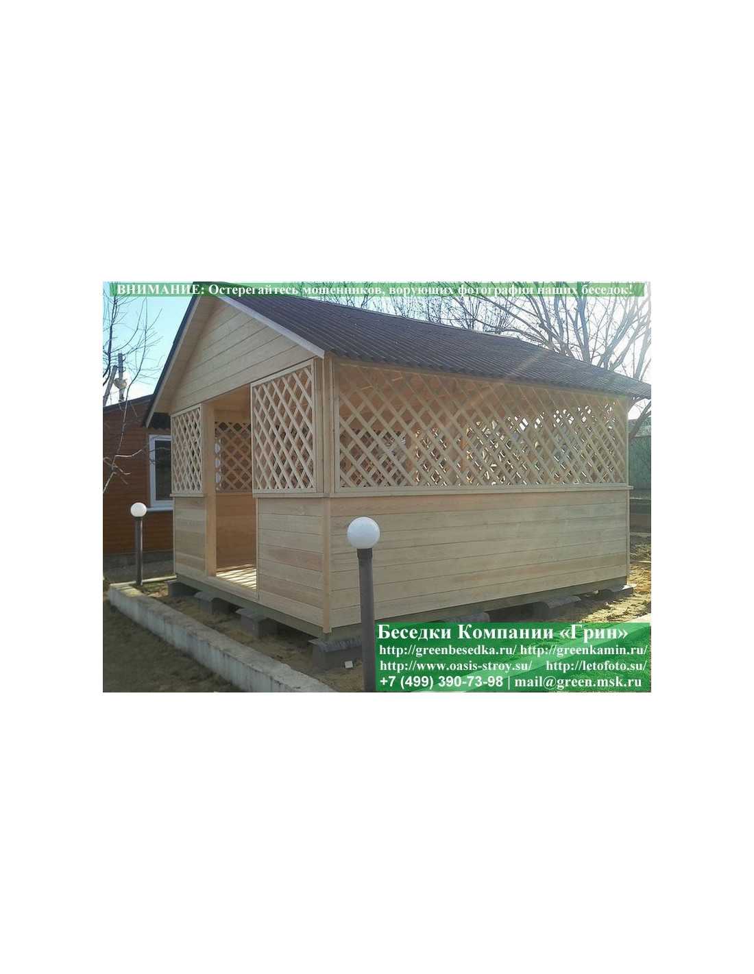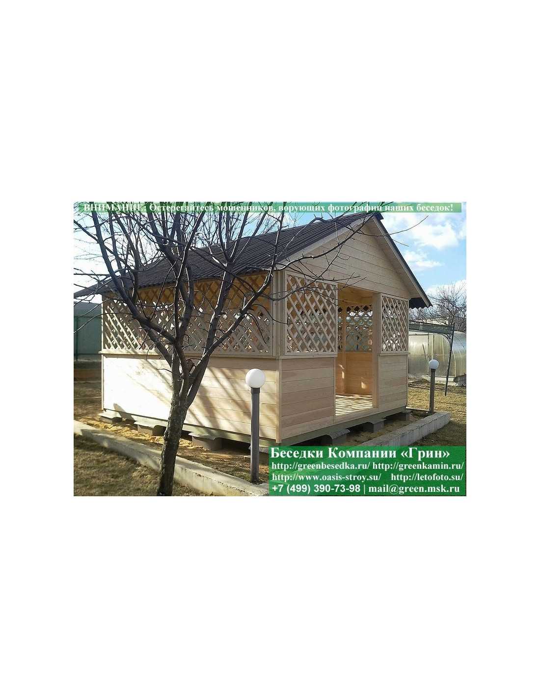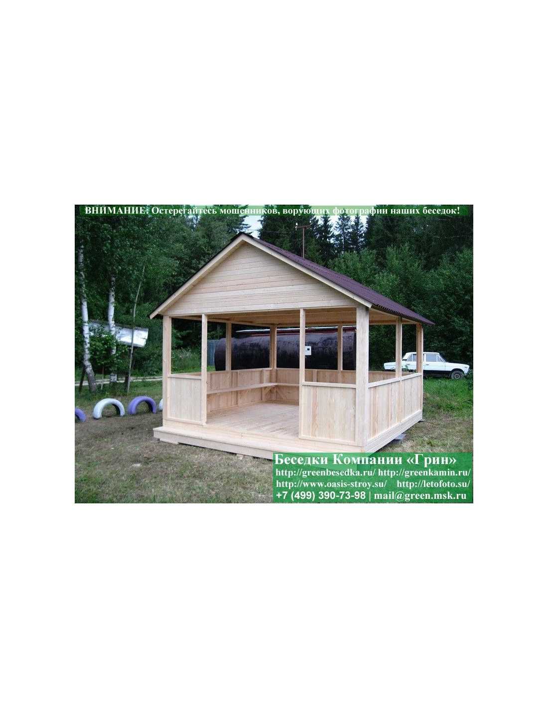 Большая квадратная беседка 4х4 изготавливается из сосны, по специальной каркасной технологии. При изготовлении беседки используется имитация бруса 17х140 мм. В качестве несущих стоек используется строганый брус. По углам 100х100 мм и перед входом 50х100 мм. В качестве пола используется фактурная строганая доска 36 мм. Срок изготовления и установки беседки на участке 5-10 дней. В весенне-летний период срок изготовления и доставки беседки может немного увеличится.