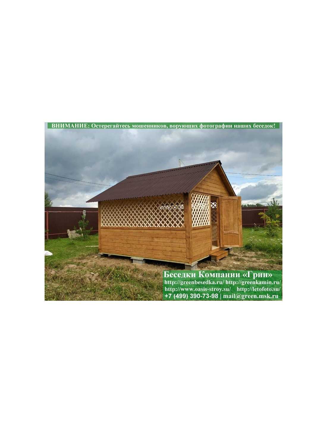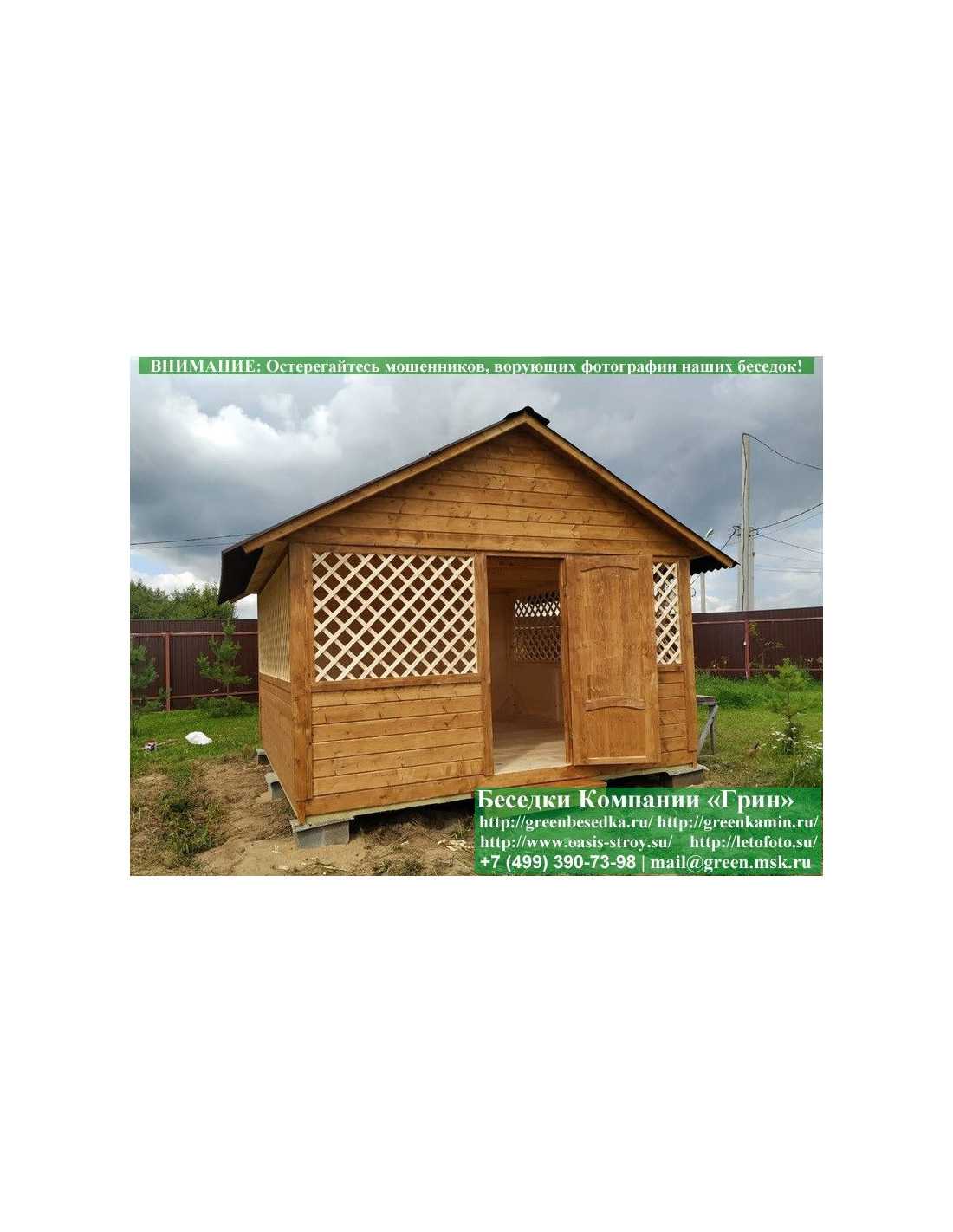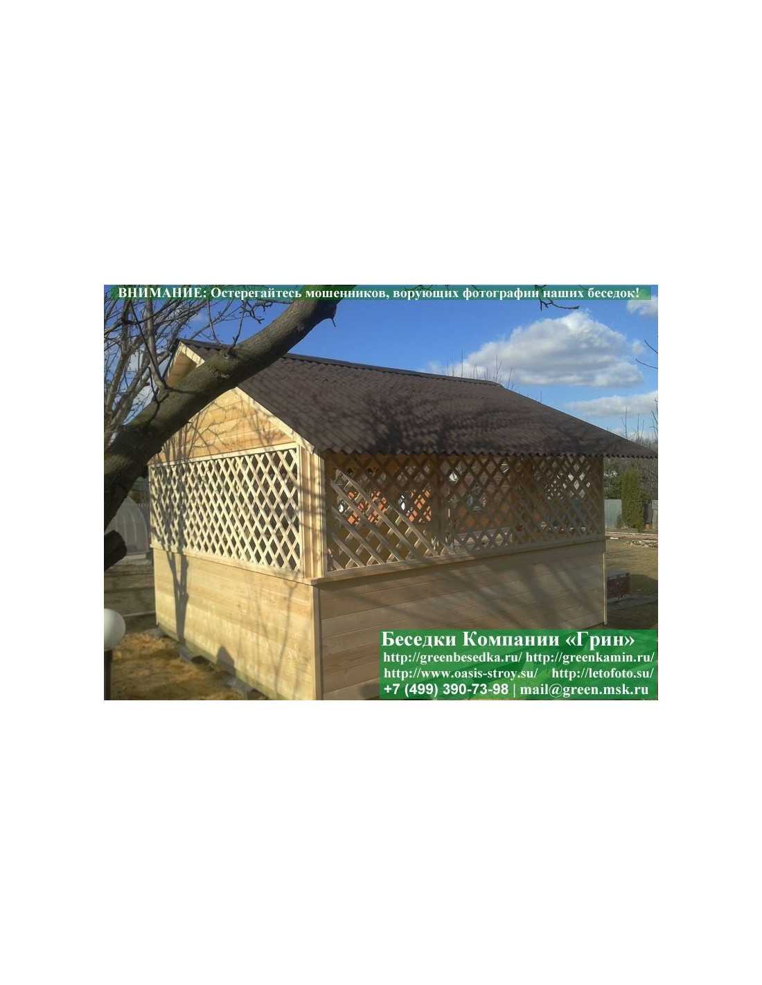 Большая квадратная беседка 4х4 изготавливается из сосны, по специальной каркасной технологии. При изготовлении беседки используется имитация бруса 17х140 мм. В качестве несущих стоек используется строганый брус. По углам 100х100 мм и перед входом 50х100 мм. В качестве пола используется фактурная строганая доска 36 мм. Срок изготовления и установки беседки на участке 5-10 дней. В весенне-летний период срок изготовления и доставки беседки может немного увеличится.