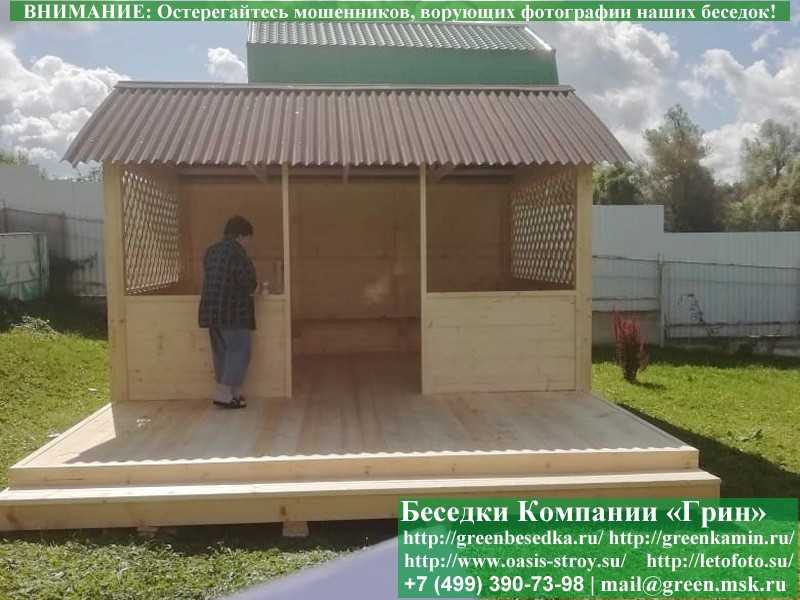 В стандартной поставке в виде кровли на крышу беседок, бытовок, хозблоков 3х4 метра кладется ондулин (мягкий шифер). Вы можете дополнительно заменить его на более надежную металлочерепицу. Цена 8000 руб.